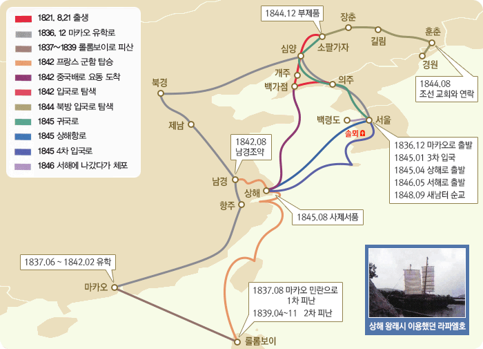 于1845年(24岁)8月17日, 在上海全家港天主教生神父(韩国第一神父)